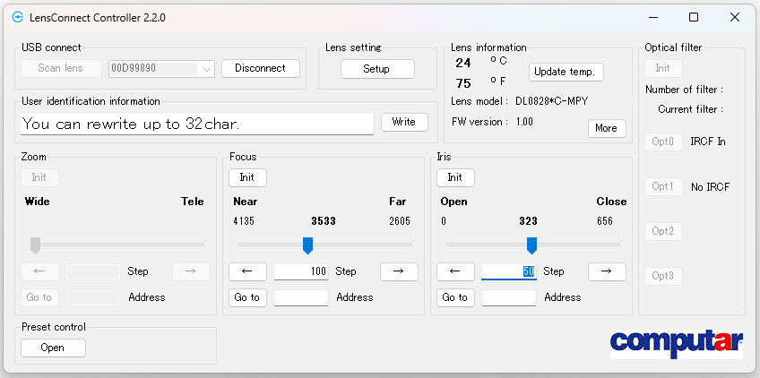 ●USBケーブル1本でPC(Windows/Linux)に接続してフォーカス調整・絞り調整がコントロール可能