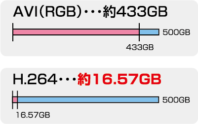 ※ H.264圧縮のファイルサイズは、映像の複雑さや動きの激しさ等でサイズが変動します。