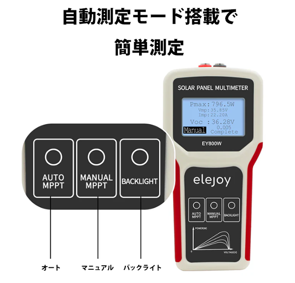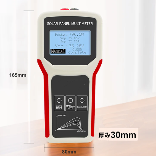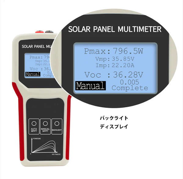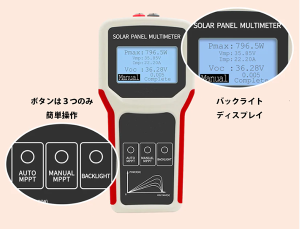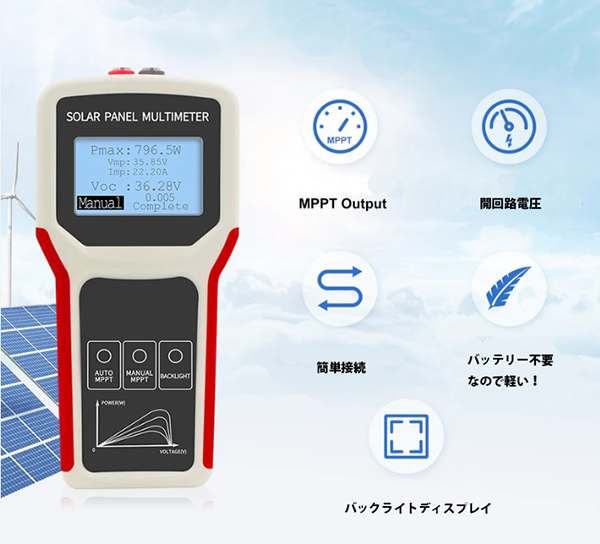| 機能 | MPPTアウトプット 開回路電圧測定 液晶バックライトあり MPPTテスト(自動、手動) 過電圧、過電流、加熱保護 過定格電力保護 |