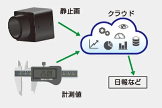 産業用カメラで撮影した静止画やデジタルマイクロメータで計測した値をクラウドに送り、日報やその他任意のデータを自動的に生成します。